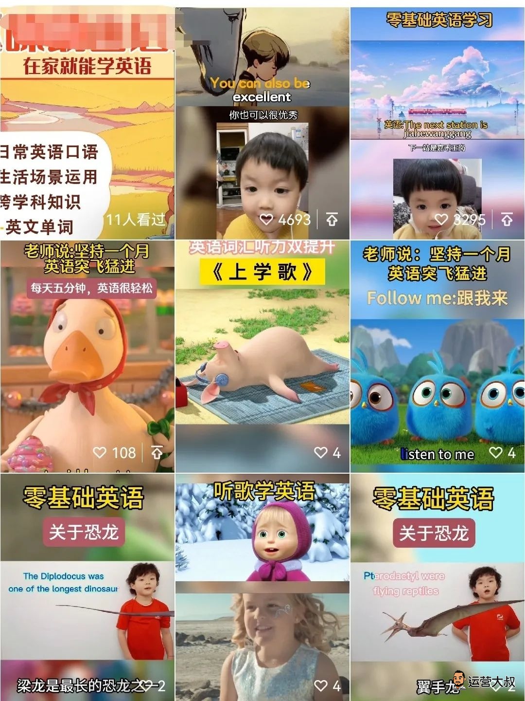 育儿号混剪+英文动画的形式具体说来就是将一些动画的视频,然后配上英文,然后模仿同行混剪视频获得流量,再利用流量视频带货。