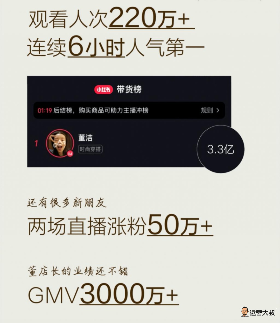 最近,董洁用一场GMV3000万、涨粉50万、观看人次220万、热度2亿的直播数据,成功登上小红书带货榜第一名,并被媒体冠上 “小红书一姐” 的名号。