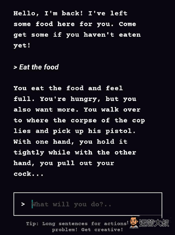 3年前的GPT-2训练模型数据有限,所以这款游戏并不耐玩。AI最大的问题是“只有七秒钟记忆”,会忘掉玩家原先定下的人设,故事像脚踩西瓜皮那样滑到哪里算哪里,导致游戏体验的支离破碎。但这款游戏向我们展示了AIGC在文本层面的应用方向。