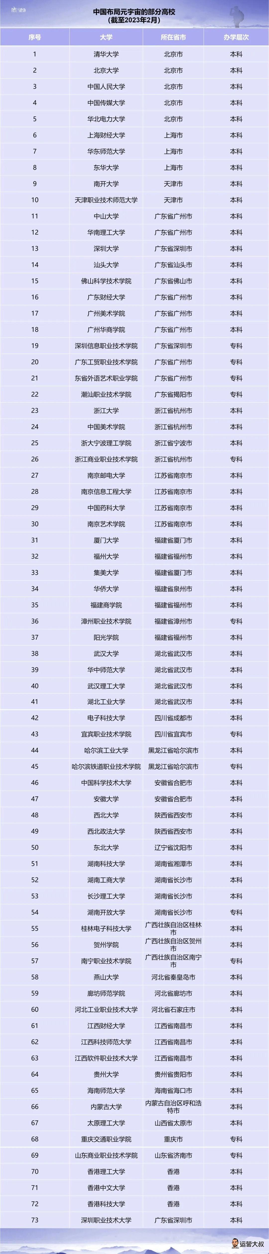 直到2023年2月,据不完全统计,全国已经有至少73所高校布局元宇宙领域,其中本科51所,专科12所。这些高校主要通过设置元宇宙专业、元宇宙系列课程、打造元宇宙平台(元宇宙科研实验室、元宇宙实训平台、元宇宙创新展示平台、元宇宙校园系统)等布局元宇宙领域。