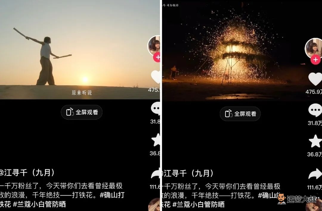 6月6日,她在视频中记录了自己苦学技艺并最终成为世界上第一位打铁花女生的详细过程。这条视频霸屏了抖音、快手、B站、小红书等多个平台,引来了无数网友的赞叹,而@江寻千(九月)也借此登上了抖音、小红书涨粉榜。