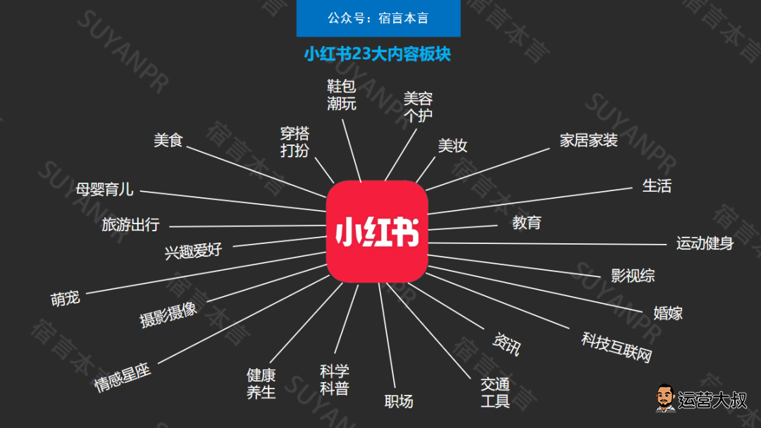 经过近几年定位的演变,小红书上的内容类别也在不断扩充,其中主流的类别就多达23个板块(如图)