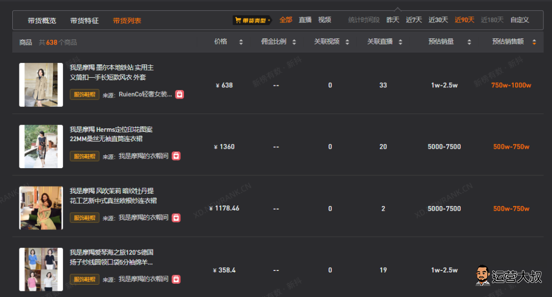 一年半过后,据新榜旗下抖音数据工具新抖 统计,“我是摩羯”近90天的累计预估GMV在2.5亿-5亿元之间,单场最高预估带货1000万-2500万元。