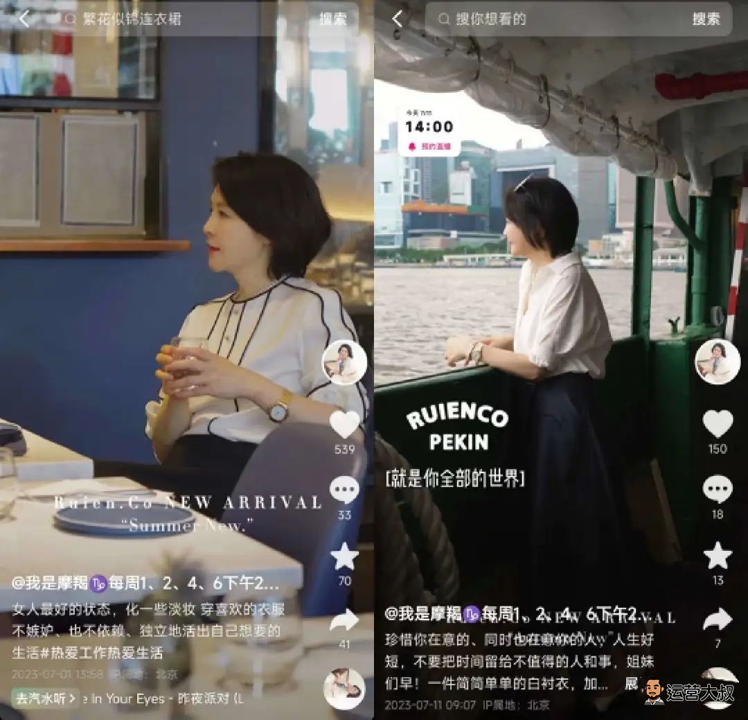 观察“我是摩羯”的抖音账号可以发现,视频并不仅仅是在展示服装,而是通过高频、简短的生活片段展示,还原出一种休闲、松弛、有气质的生活氛围。
