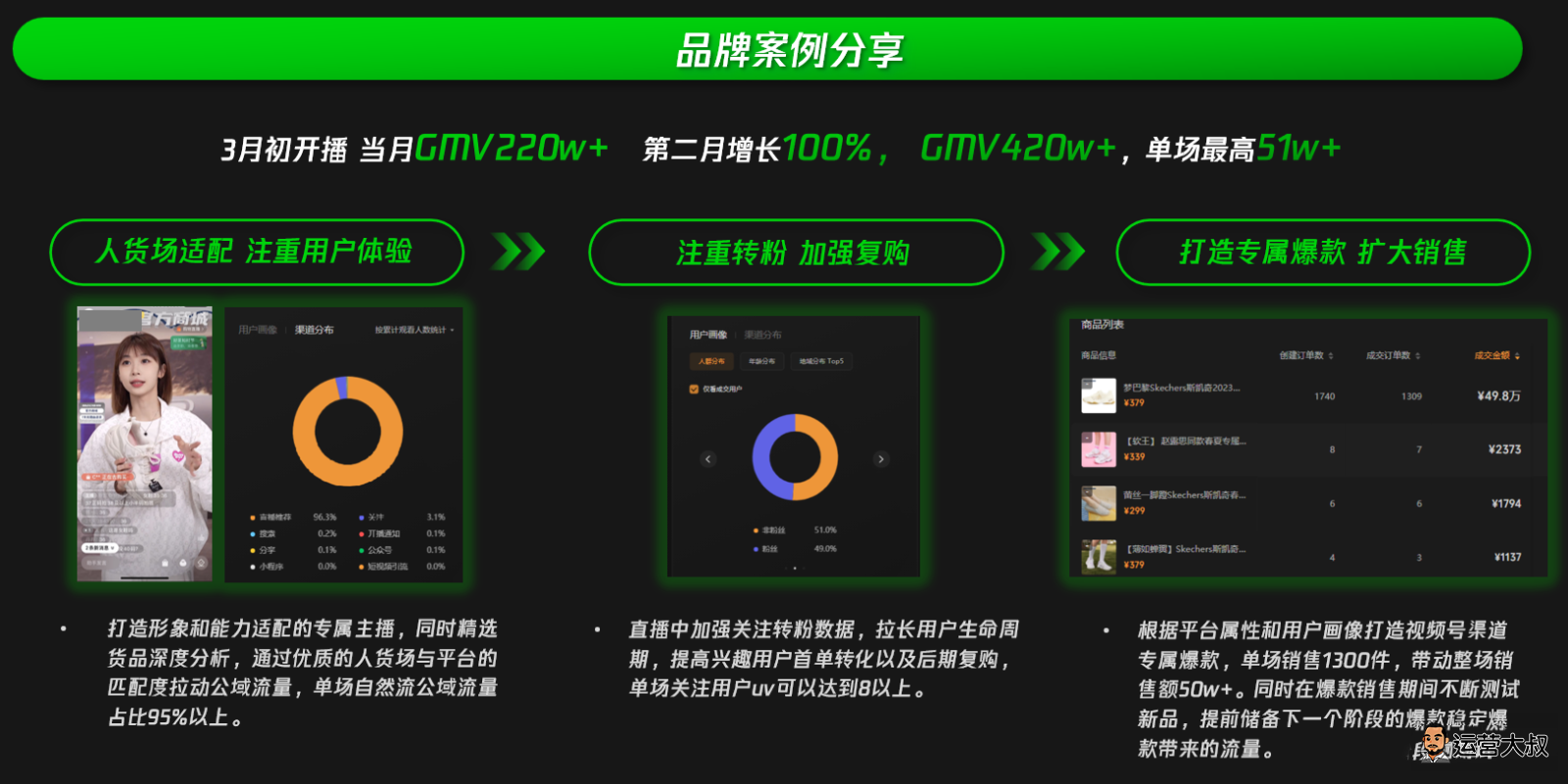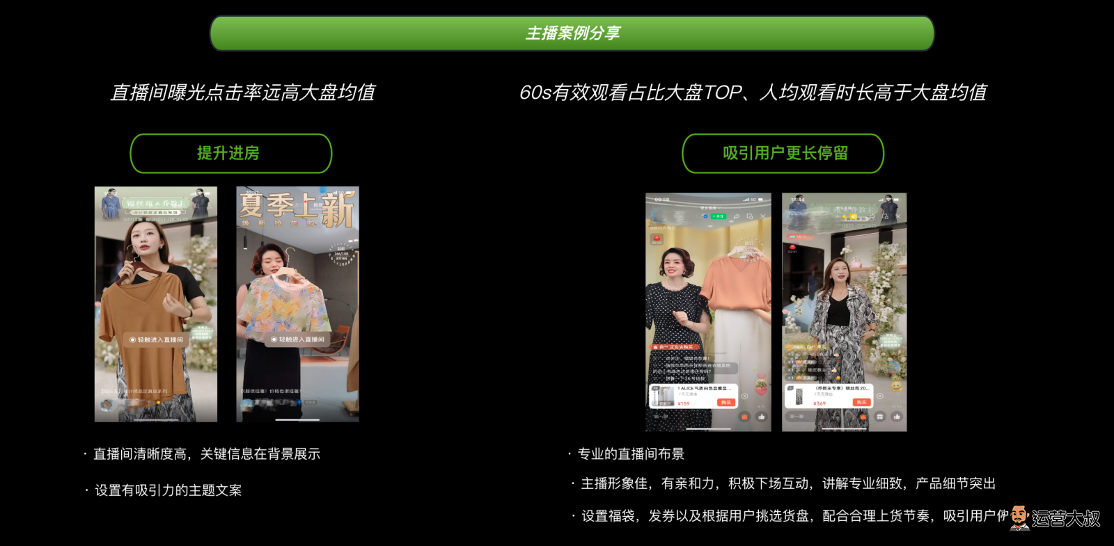 (1)人货场匹配,做有吸引力的直播间内容:选择和直播主题,目标用户匹配的主播,通过精巧的直播间布景,主播话术、福利安排、以及得当的直播节奏设计,吸引用户停留更长时间;