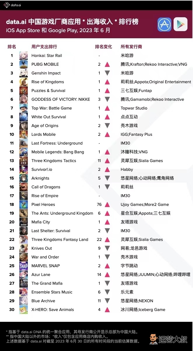 2023 年 6 月中国游戏厂商及应用出海收入排行榜出炉,厂商收入榜单前六名依旧稳定,按排名先后顺序依次是:第一米哈游、第二腾讯、第三莉莉丝、第四三七互娱、第五点点互动和第六名 IM30。