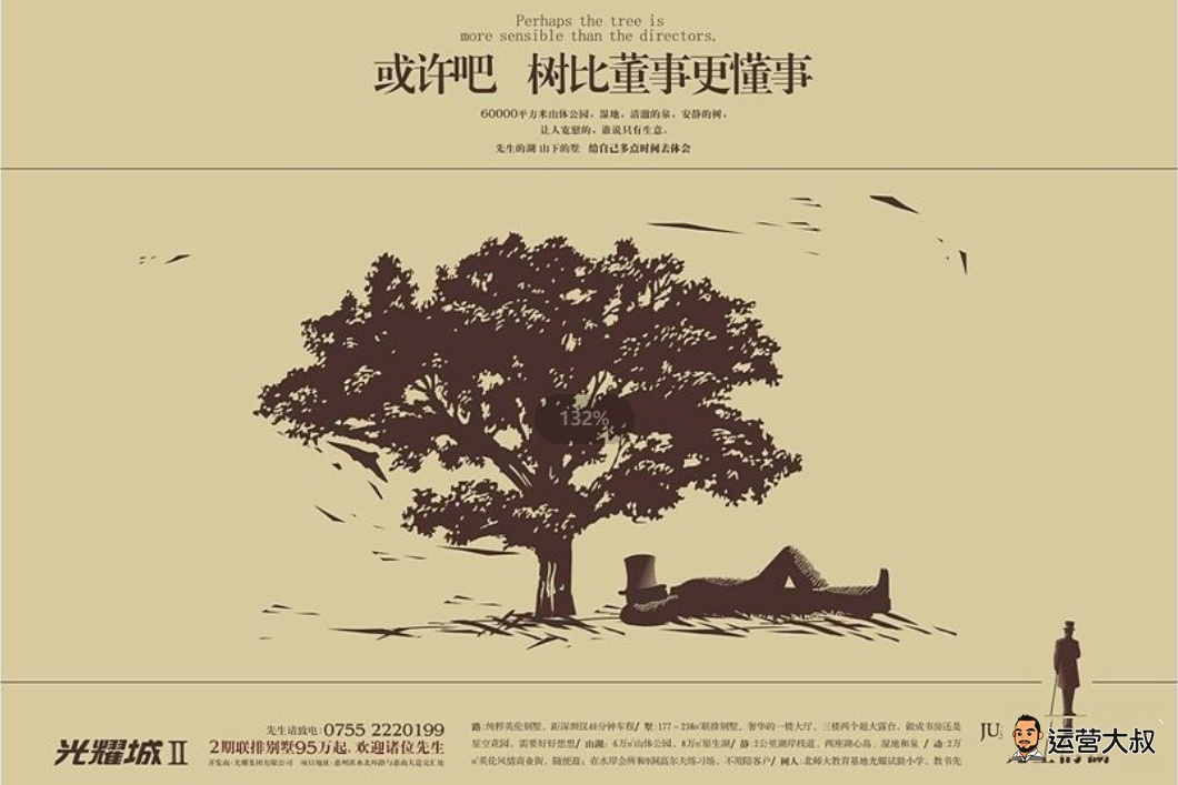 它传播载体窄。从最开始的报广软文、高炮大牌,到后来的派发单页、张贴海报。如果说创意广告是在火柴盒里跳舞,那么地产广告就是在火柴盒里绑着双脚跳舞。