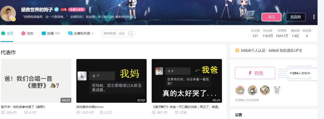 该 UP主的视频合集中,爹妈出演的短视频,远超个人独唱的数据一大截。粉丝们笑称:拯救世界的狗子,最终还是被爹妈拯救了播放量,不愧是啃老区 UP 主。