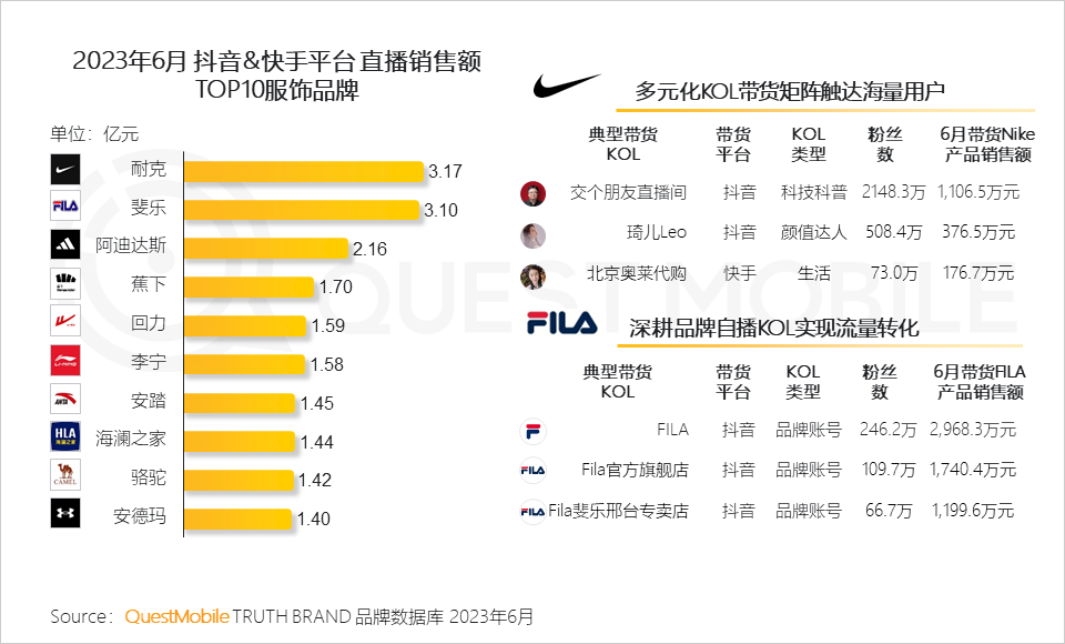 Ⅱ. 服饰行业 – 围绕品牌销售转化,服饰品牌深化各自的新媒体平台带货策略,持续驱动品牌增长,如耐克借力达人带货,斐乐深耕品牌自播