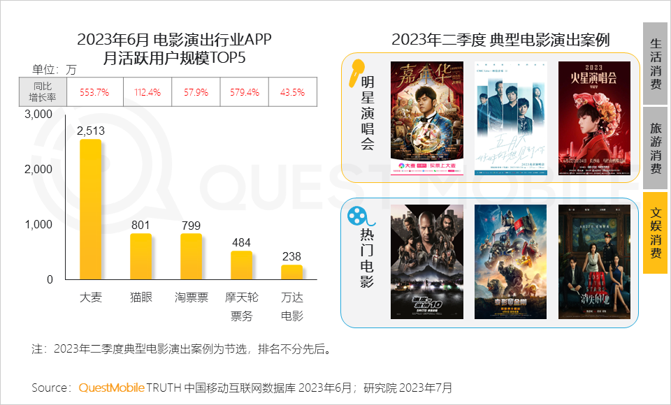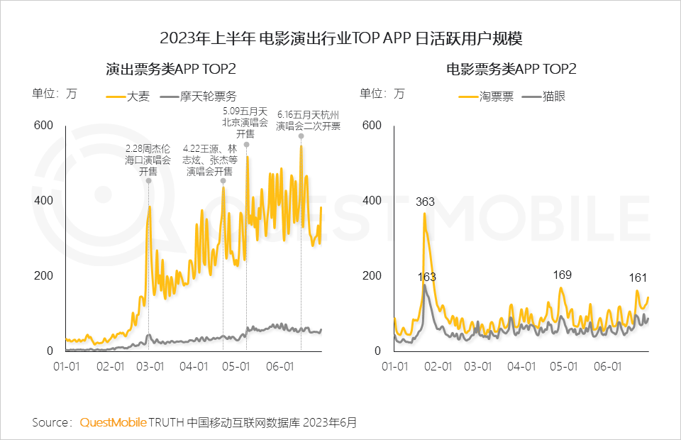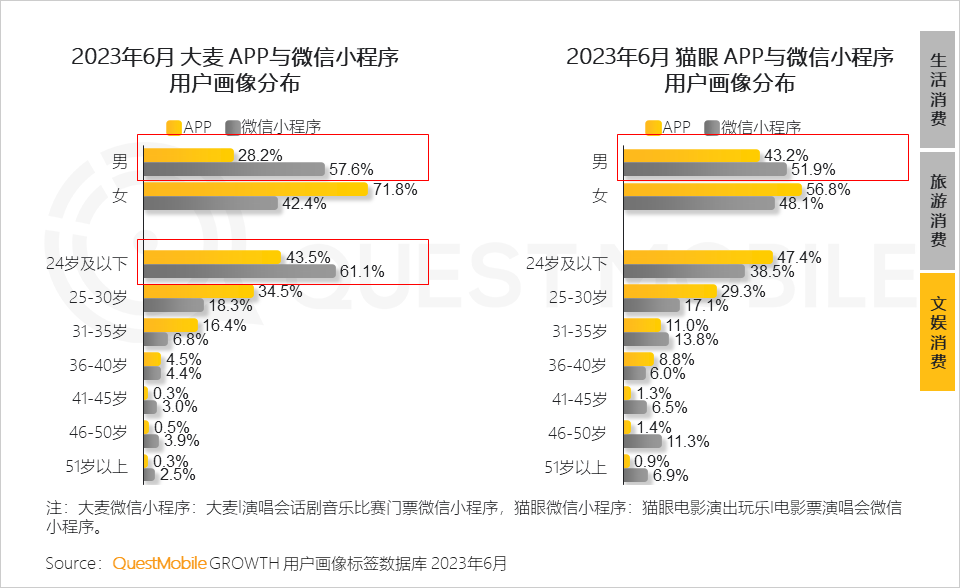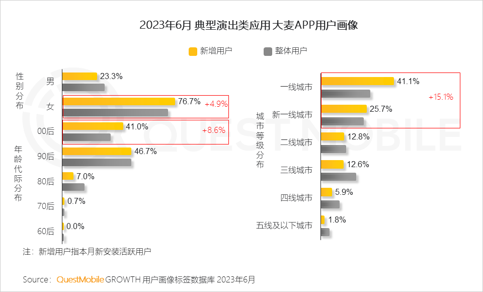 QuestMobile2023年6月数据显示,演出类票务应用—大麦APP,新增用户中00后占比超四成,较APP整体用户提升8.6%;线下演出、演唱会等活动的复苏,吸引更多年轻女性、一线及新一线用户参与。