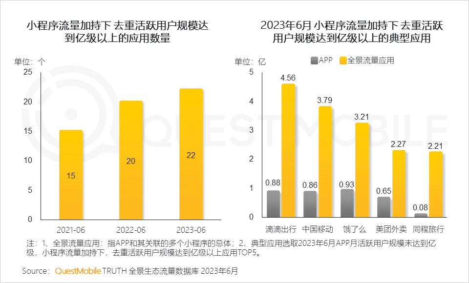 QuestMobile数据显示,在APP端没有达到亿级,但在小程序流量加持下实现亿级突破的应用逐年递增,截止2023年6月,已有22款应用实现亿级流量的突破。