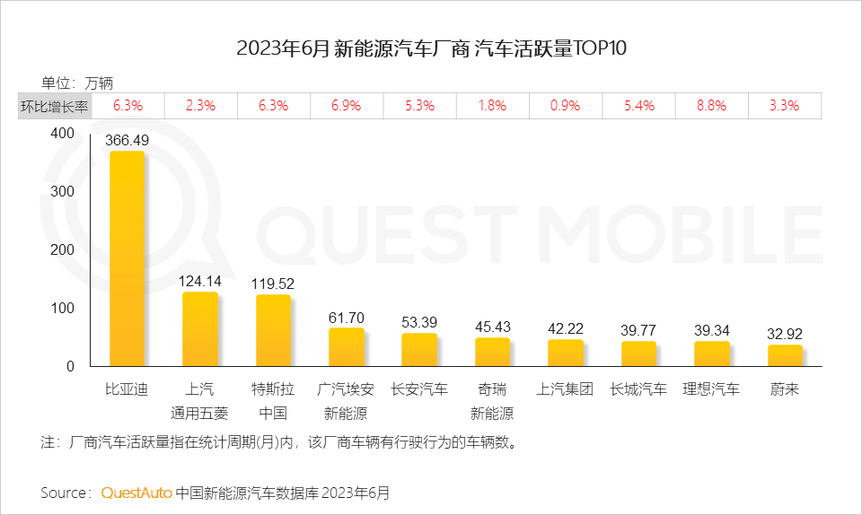 QuestAuto数据显示,比亚迪6月汽车活跃量已达366万辆,上汽通用五菱、特斯拉中国活跃量均超百万,理想汽车、广汽埃安新能源等增速明显。