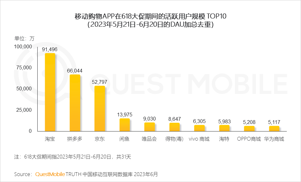 Ⅲ. 年中大促期间,头部平台依旧获得主体流量,此外,随着国产终端厂商推陈出新,并依托存量移动设备流量池,vivo、OPPO、华为等旗下自建垂直平台,亦获得5千万以上的去重流量