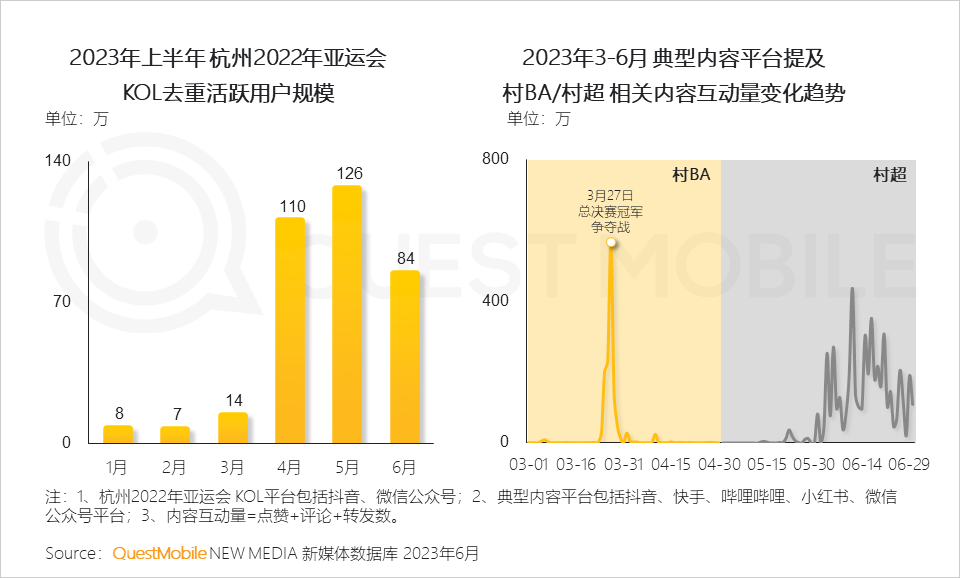 用户稳定增长和粘性变化,与当前餐饮娱乐、旅游出行复苏、体育运动热情高涨的社会氛围关系密切。2023年6月,电影演出行业同比增长达到172%,航班、火车出行行业同比增速超50%,酒店服务、在线旅游等旅游行业同比增速超35%,复苏态势显著。同时,村BA、村超、成都大运会、杭州亚运会持续激发体育要运动热情,典型平台的内容热度持续提高。