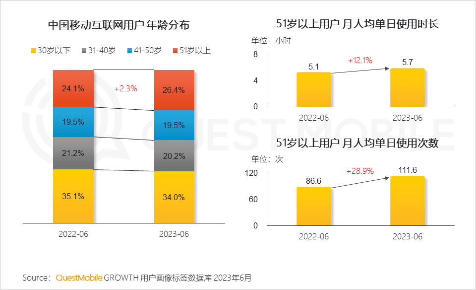 今天给大家分享一下中国移动互联网半年大报告。QuestMobile数据显示,截止到2023年6月份,移动互联网月活用户为12.13亿,整个上半年,用户规模增长稳定,维持在2%-2.5%之间,同时,用户粘性持续加深,月人均单日使用时长达到7.2小时,同比增长7.7%,月人均单日使用次数达到116.3次,同比增长5.4%。这背后,银发人群持续增长,51岁以上用户人群占比已经达到了26.4%,占比提升了2.3%。