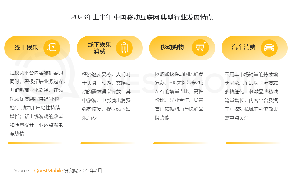QuestMobile数据显示,2023年6月电影演出行业同比增长最为显著,达172%;航班、火车出行行业同比增速超50%,酒店服务、在线旅游等旅游行业同比增速超35%,复苏态势显著;智能汽车、智能配件行业同比增速超40%;另外有声听书、健康管理、手机游戏部分细分行业同比也呈现较高增长。