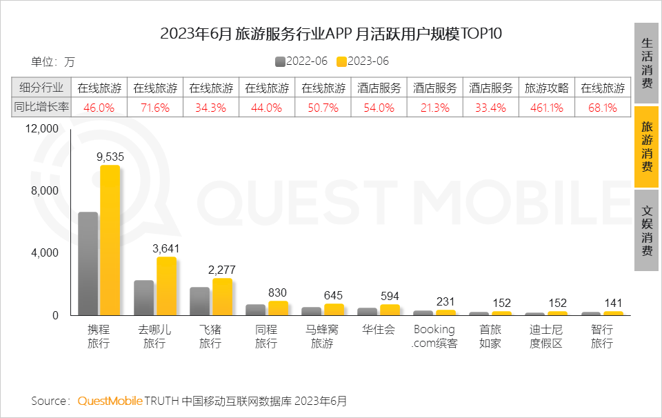 2.8 2023年上半年,我国旅游市场持续恢复,居民旅游出行需求大量释放,旅游服务行业规模增长,其中6月活跃用户规模达1.54亿,增幅33.7%