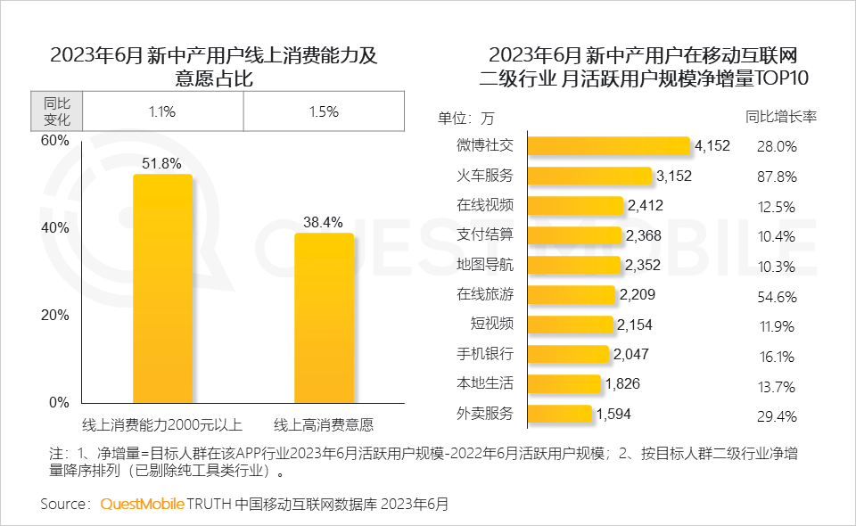 三线城市以上、25岁到40岁之间的“新中产”核心群体,线上消费能力及意愿持续复苏、稳步提升,2023年6月线上消费能力超2000元用户群体突破51.8%,高消费意愿群体占比超过38.4%;与此群体密切相关的娱乐、旅游、美食等消费需求正在释放,火车服务、在线旅游、外卖服务月活用户规模同比增长87.8%、54.6%、29.4%;