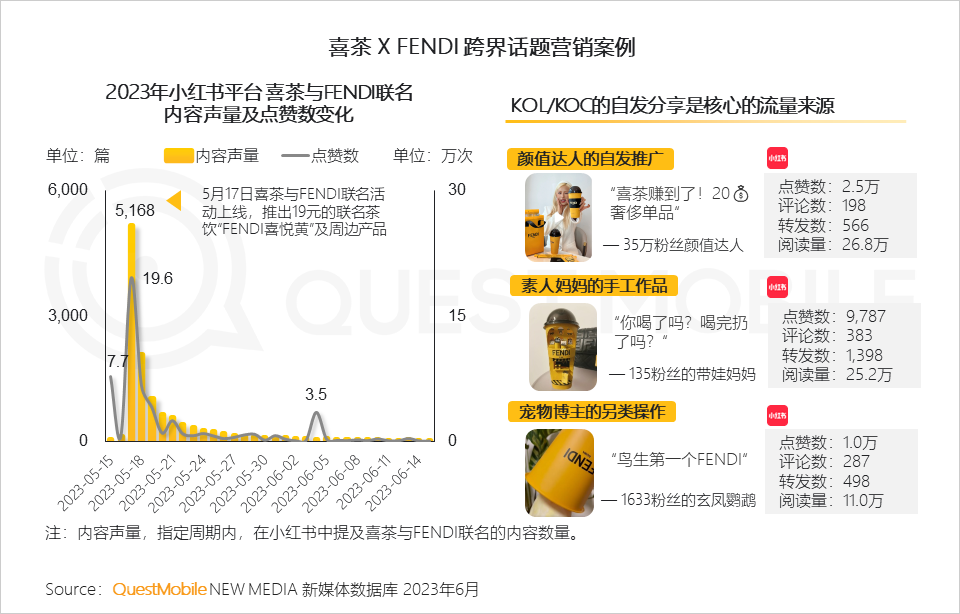 3.3 新颖的跨界联名依旧如火如荼,如喜茶与FENDI跨界联名,双方产生“化学反应” ,令喜茶成为离年轻人最近的奢侈品,激发消费者的好奇心和创造力,实现用户的自发传播,增强品牌势能