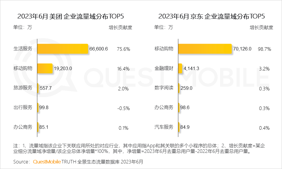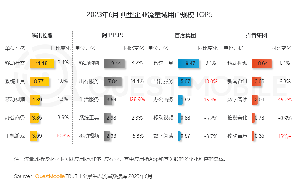 随着复苏态势稳定,这些“头部玩家”发力方向正在发生微妙变化,腾讯在手机游戏领域用户增长了10.8%,阿里巴巴在生活服务领域用户增长了128.9%,百度在出行服务、办公商务领域分别增长了18.0%、15.4%,抖音集团在移动音乐和数字阅读领域分别增长了15倍(惊悚😱)、45.2%;同时,垂类“头部玩家”的新增长领域也有新发展,例如美团的移动购物领域用户增长贡献度已经达到了16.4%……