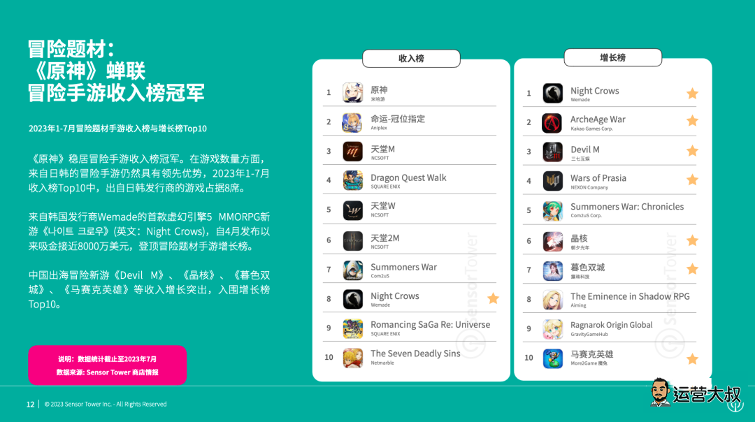 在冒险手游赛道,《原神》蝉联2023年1-7月手游收入榜冠军。中国出海冒险新游《Devil M》、《晶核》、《暮色双城》、《马赛克英雄》等收入增长突出,入围增长榜Top10。