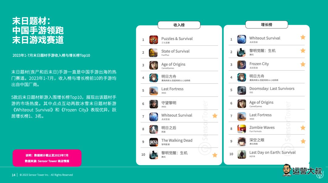 末日题材(丧尸和后末日)手游一直是中国手游出海的热门赛道。2023年1-7月,收入榜与增长榜前10名的手游均出自中国厂商,同时有5款后末日题材出海新游入围增长榜Top10。