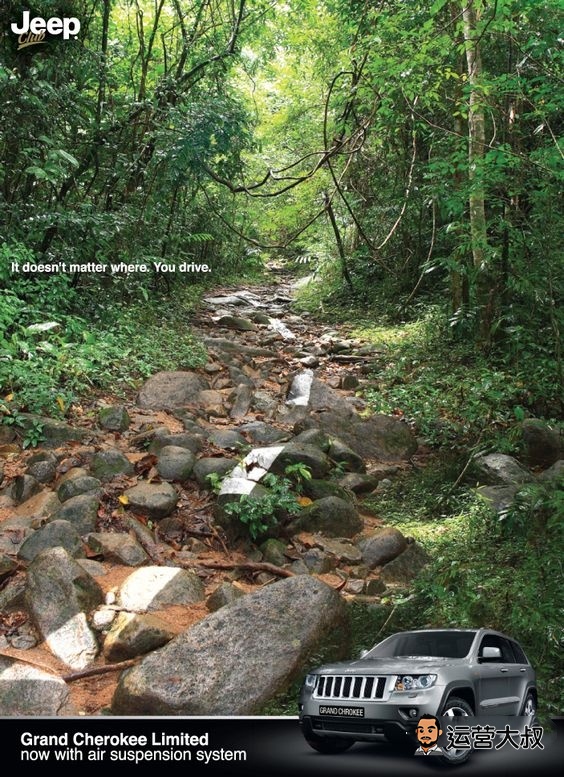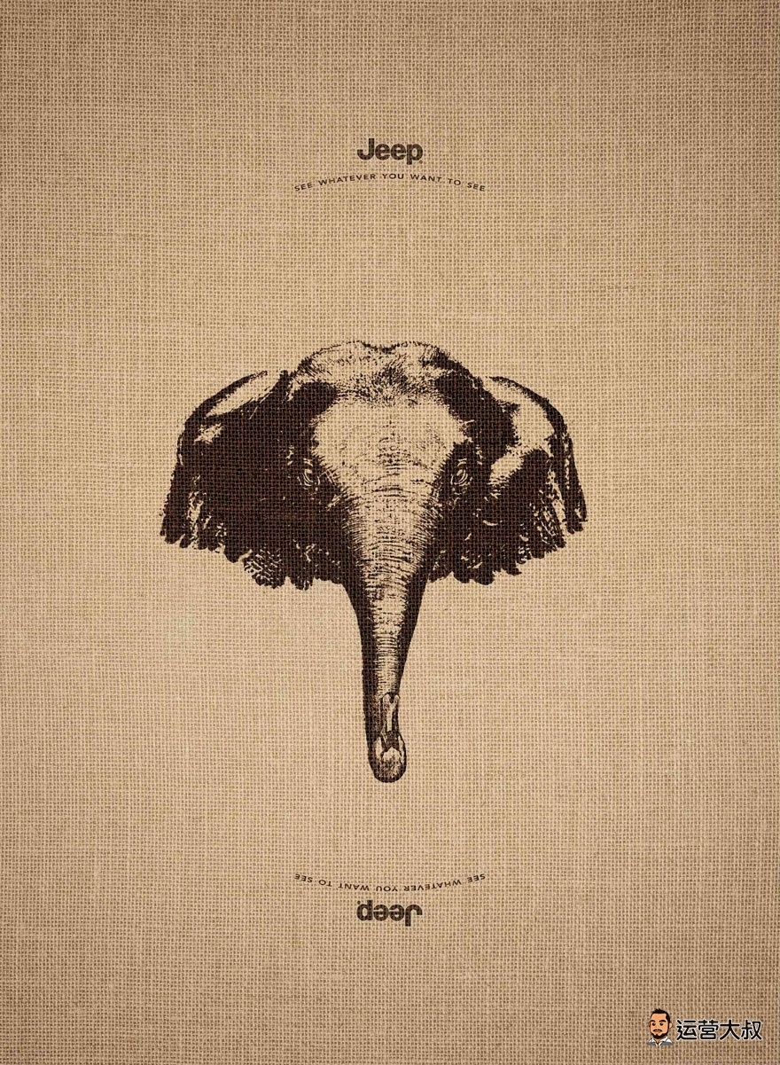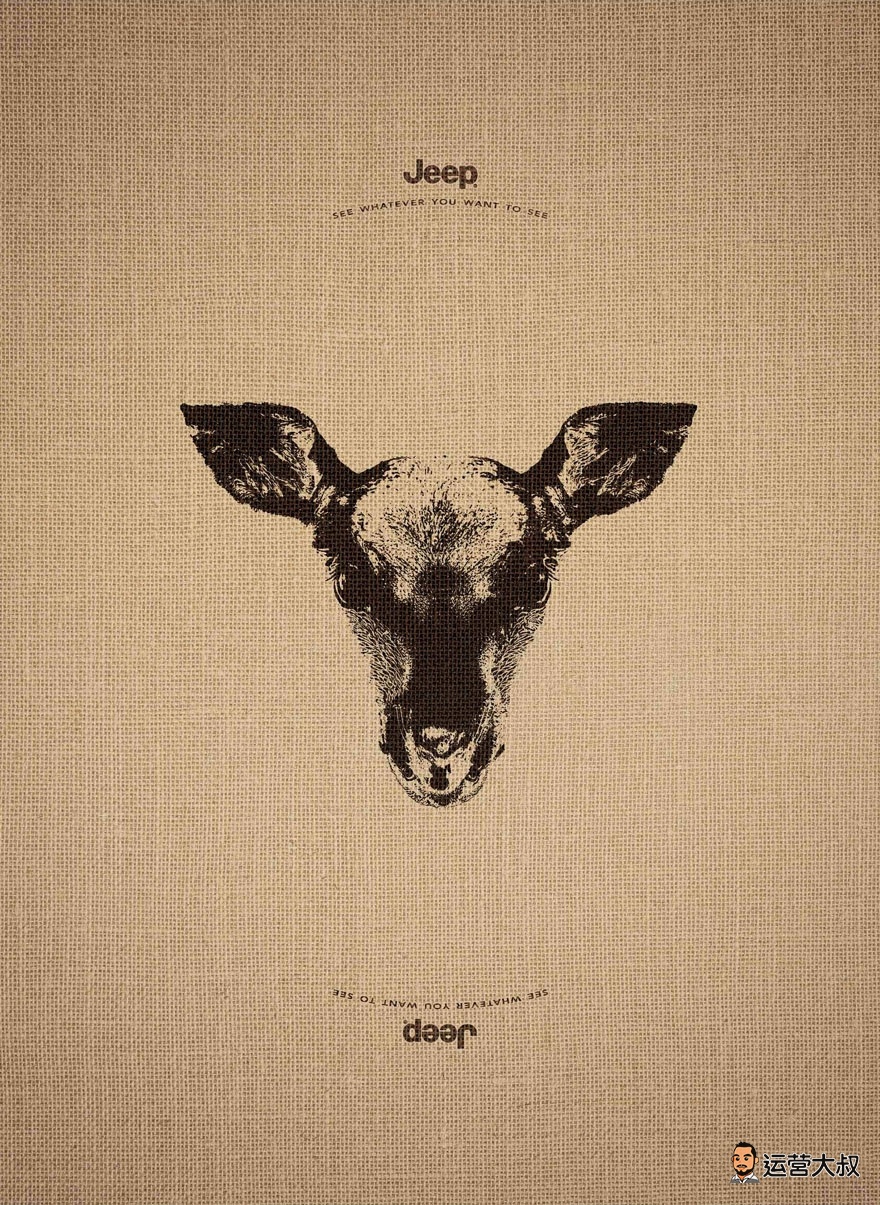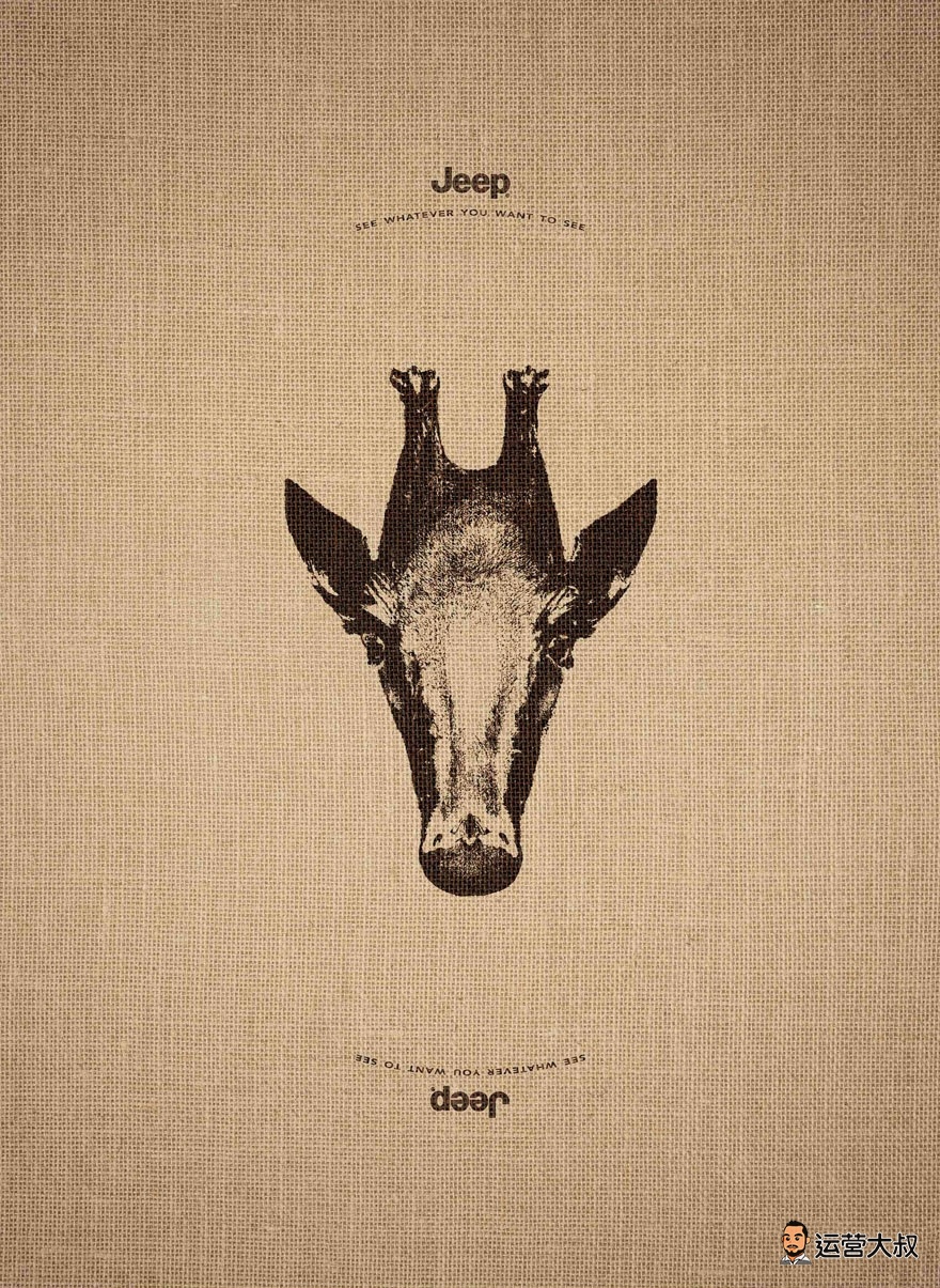 下面这三张Jeep的海报,正着看、倒着看分别是不同的动物(不信可以试试),这就是Jeep的魅力,可以让你看到你想看到的一切。