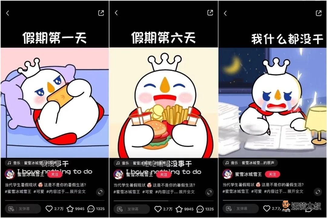 @蜜雪冰城雪王 走的是 “剧情+动画”路线,账号的目的不为变现,而是塑造雪王这一IP。作品中,雪王被赋予了很多人类的情感,从性格上来说就像一个有点偷懒、有点贪吃的普通大学生。随着暑假到来,雪王也成功打入学生大军中,一举一动唤起了粉丝们的共鸣。
