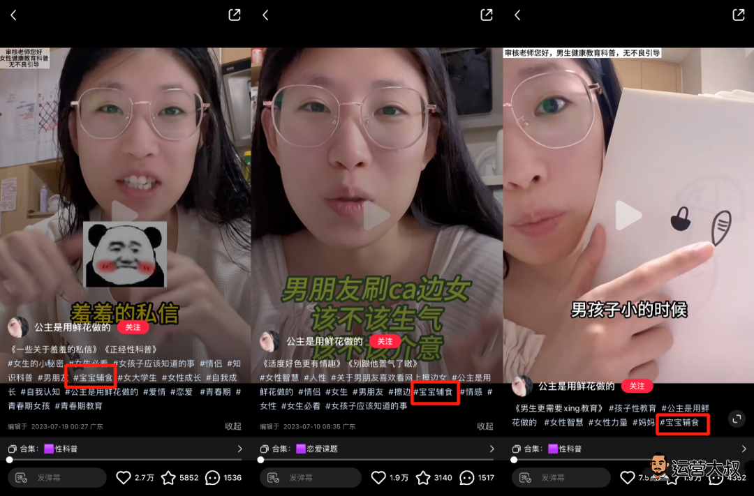 有意思的是,她的视频文案中除了#女性#、#情感#、#恋爱#等相关标签外,还打上了#宝宝辅食#这个看似没有任何关联的标签。