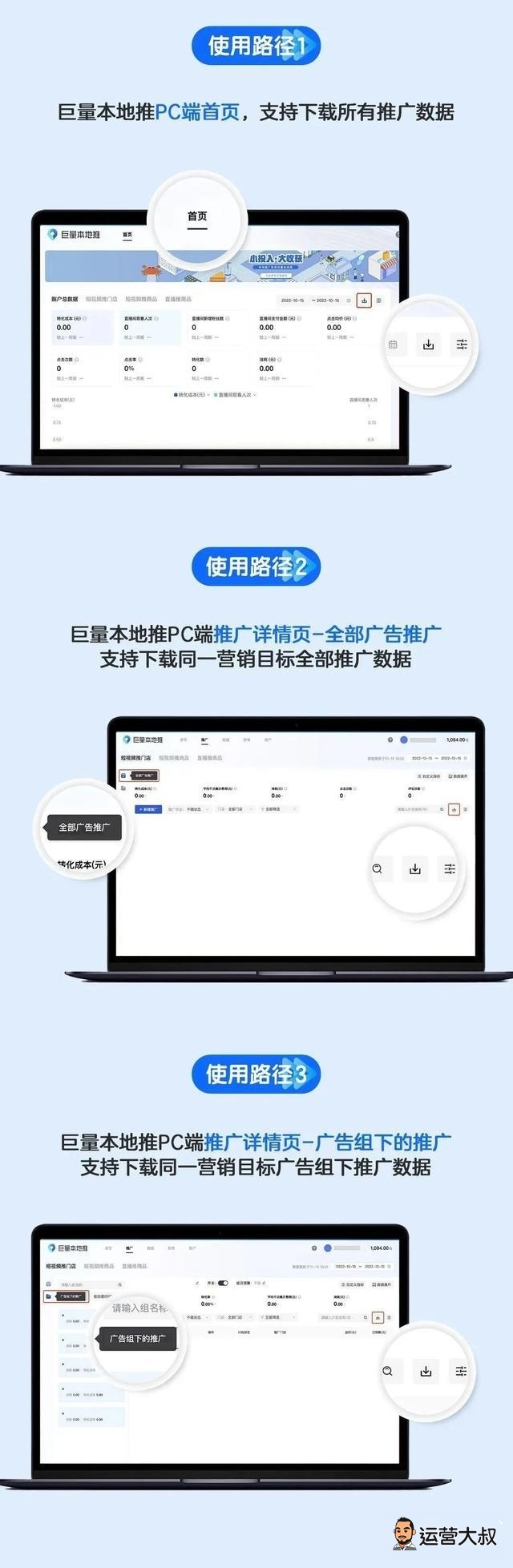 巨量本地推PC端支持丰富的数据维度下载,助力广告主精细运营,可依以下路径点击按钮下载数据报表。