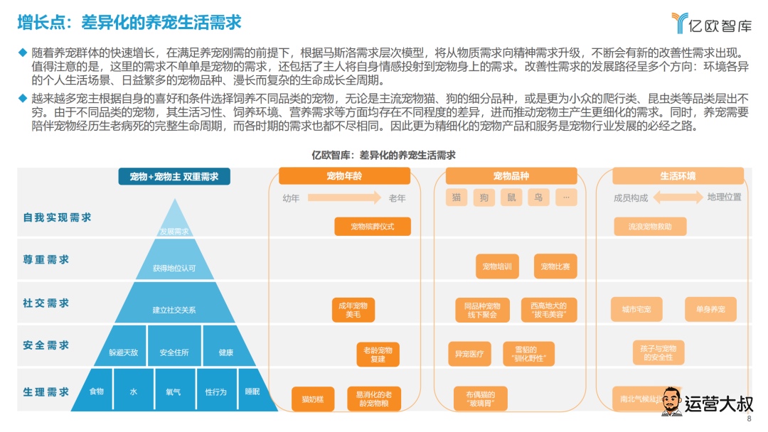 随着养宠群体的快速增长,在满足养宠刚需的前提下,根据马斯洛需求层次模型,将从物质需求向精神需求升级,不断会有新的改善性需求出现。值得注意的是,这里的需求不单单是宠物的需求,还包括了主人将自身情感投射到宠物身上的需求。改善性需求的发展路径呈多个方向:环境各异的个人生活场景、日益繁多的宠物品种、漫长而复杂的生命成长全周期。