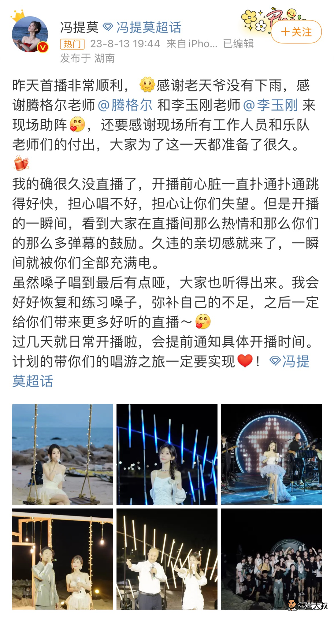 而冯提莫,则完全是另一个路数。首播不在直播间,而是设置在一处海边;曲目是有排播设计的,还邀请了李玉刚、腾格尔作为嘉宾;过程中甚至还有弘扬传统文化的段落,某种程度上堪比综艺。种种迹象都表明,冯提莫走的更像是抖音此前屡次尝试的音乐会直播路线。