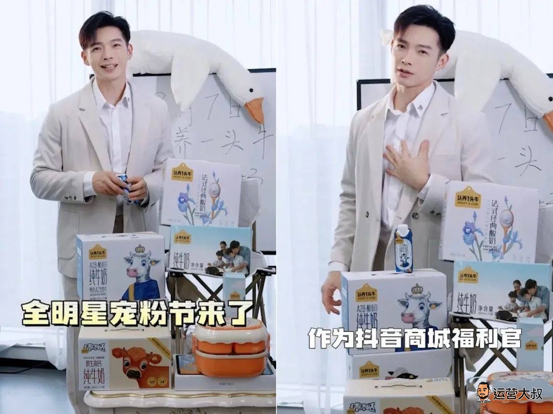 之所以能在短期内呈现出如此巨大的爆发力,除了得益于认养一头牛平时对抖音商城的重点运营,还在于认养一头牛参加了由抖音商城举办的「全明星宠粉节」活动。在这场活动中,明星辰亦儒化身抖音商城福利官,通过预热短视频、助阵直播间等方式吸引了大量用户进入抖音商城搜索“认养一头牛”并领取相关福利,从而加速了用户在商城的消费决策和落地购买。