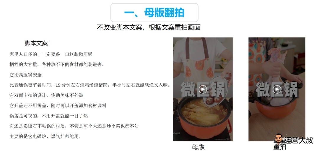 像上述的两个案例对比,文案是一样的,创作团队只需要翻拍画面即可,画面组合上,如果不涉及到违规,直接引用部分同行画面也可,如果不能用就一比一翻拍,非爆点画面则可做适当改编,比如背景、机位、道具等。