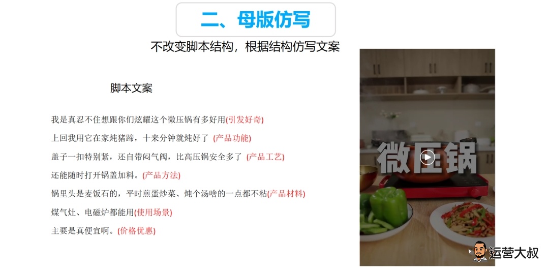 按照之前文章“万字长文的脚本创作”的技巧,提炼脚本结构,不改变原有脚本结构,比如原有结构是开头(引发好奇)+卖点(功能+工艺+方法+材料+场景)+结尾(价格优惠)不改变,只根据同结构撰写文案。
