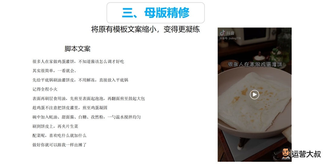 将素材翻译成口播文案,然后一边看一边修句,看哪些部分是可有可无的,哪些是必须留下的,留下精华的部分后进行语义结构的稍微修正即可。