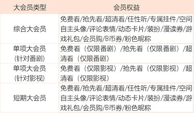 ③单项大会员:包括影视和番剧大会员套餐。由于仅针对某类内容,单项大会员只享受免费看某类内容、抢先看某类内容、高清看某类内容,其余权益均不享受。