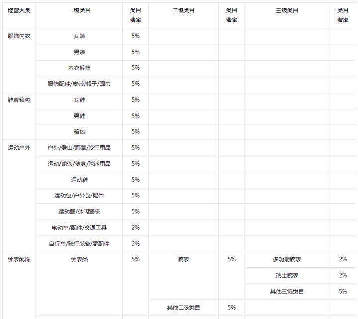 大部分常规类目的服务费是5%,比如,男装、女装,鞋靴箱包,全类目扣点都是5%。