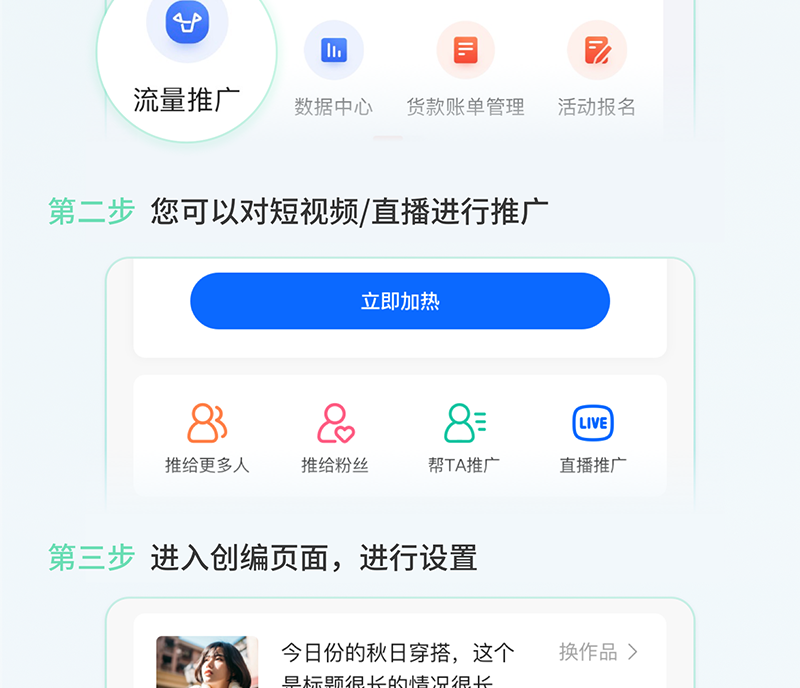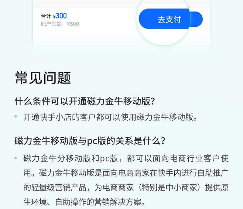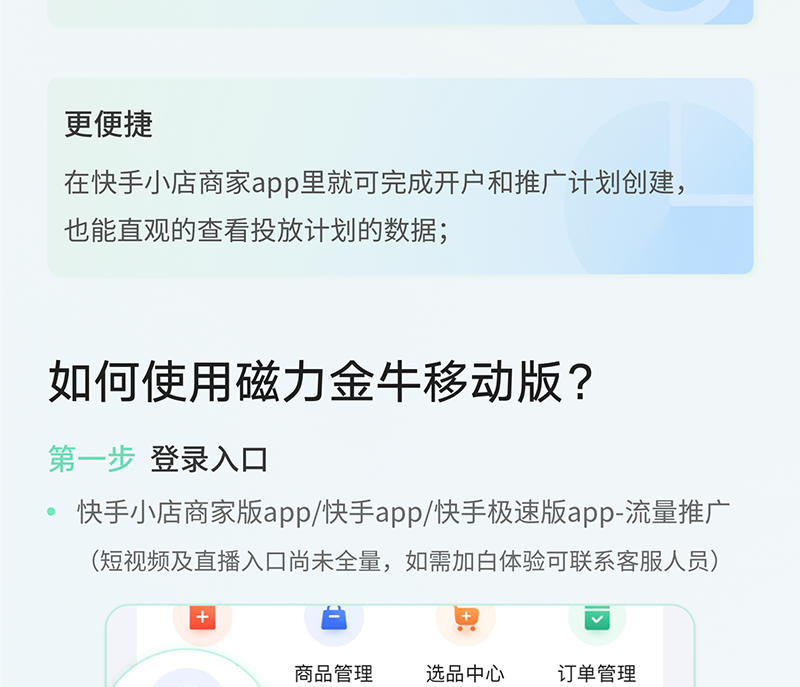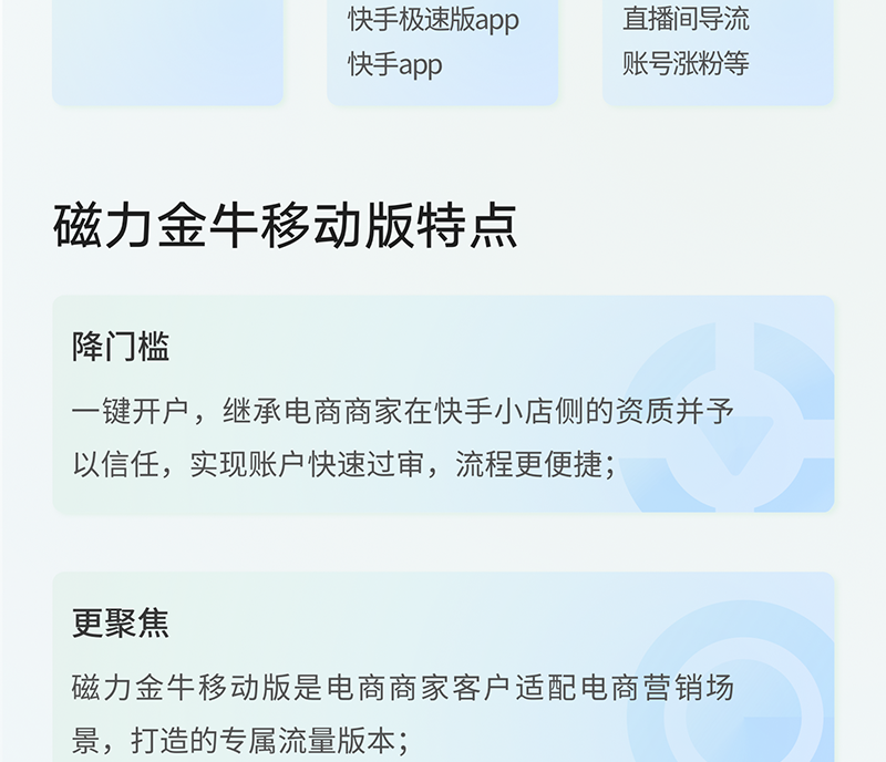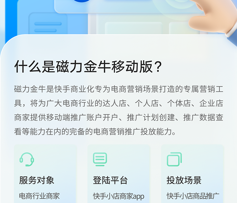 快手之磁力金牛是什么? 快手 23年2月28日 编辑 运营小编 取消关注 关注 私信 什么是磁力金牛? 磁力金牛移动版是为快手小店商家的专属打造的移动端营销推广工具,在手机上动动手指,就能轻松助力带货提升!速来体验吧~~ 给TA打赏 共{{data.count}}人 人已打赏 快手磁力金牛