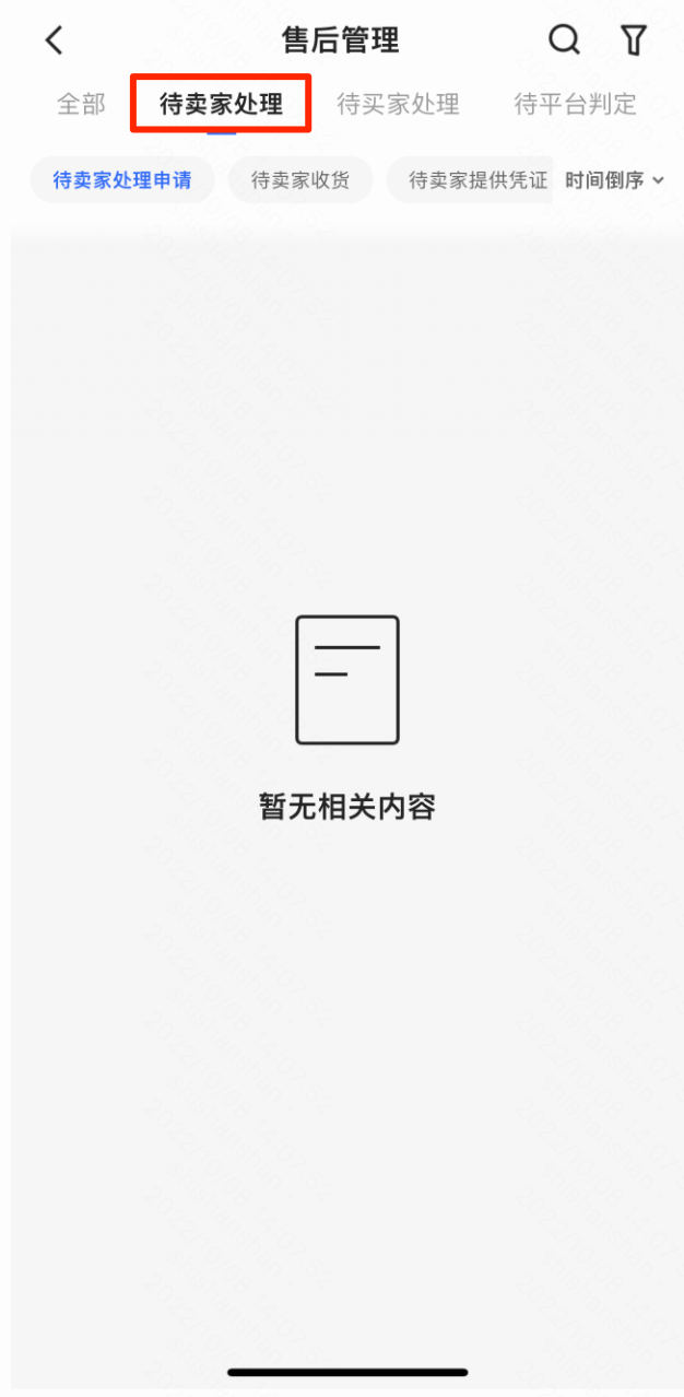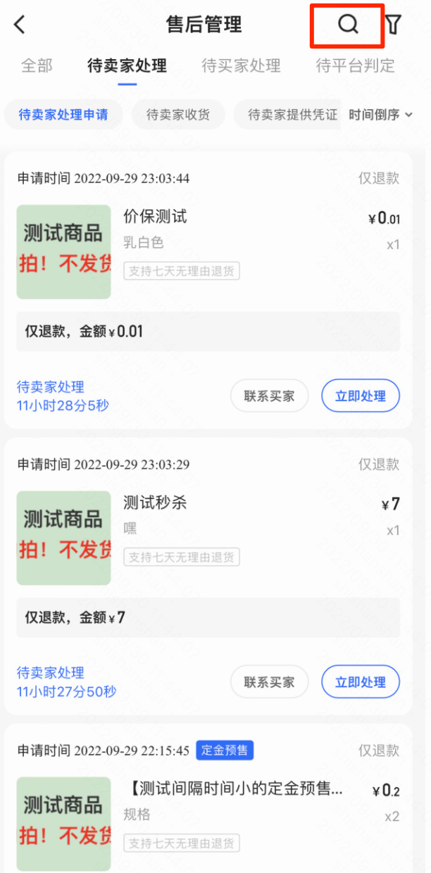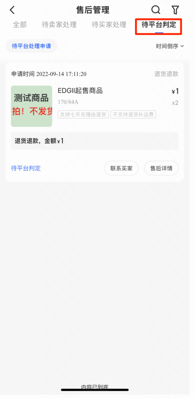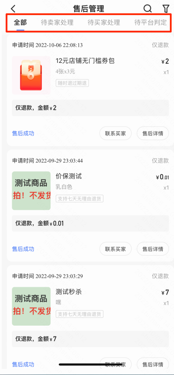 售后管理页面根据售后单状态划分为“待卖家处理”,“待买家处理”,“待平台判定“,商家可根据状态进行筛选;