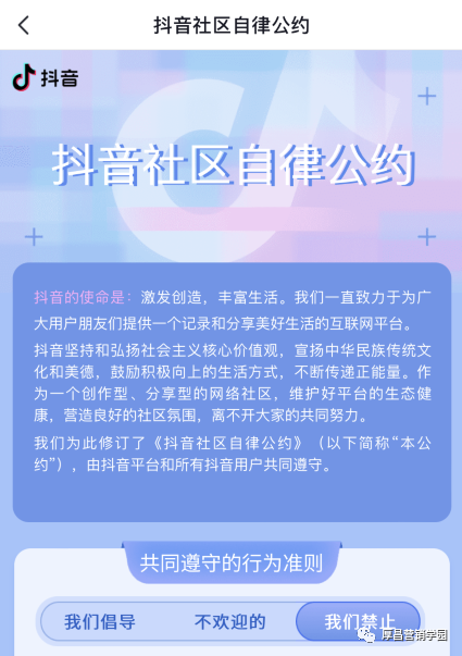 手机进入抖音点击我点击三条杠图标找到设置点击抖音规则中心,然后找到社区公约点击之后就可以看到抖音平台倡导的不欢迎的和禁止的内容了。