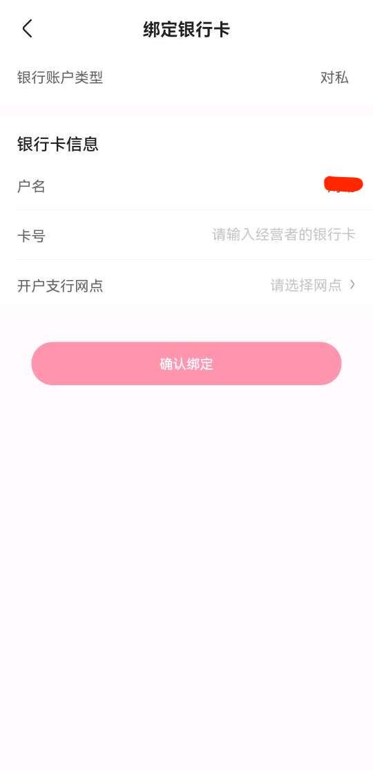个人类型主体——需验证经营者本人实名认证手机号的验证码,验证成功后即可绑定银行卡信息。账户类型仅支持对私账户,填写对私的银行卡卡号和开户支行网点,点击【确定绑定】后即可完成绑定。