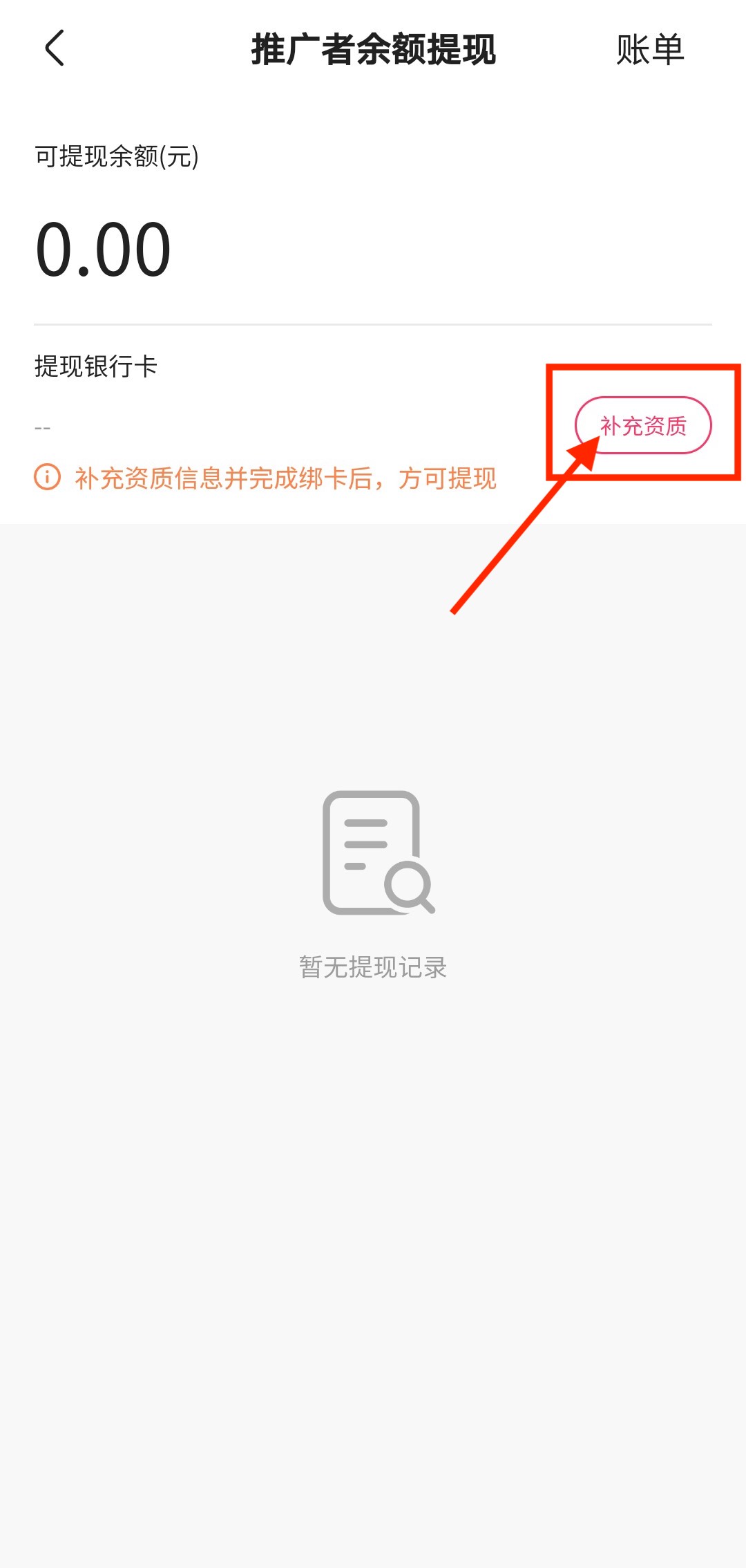绑定路径:点击【app端卖家后台】-【佣金收入】-【账单管理】-【达人钱包】,看到安心钱包卡片后点击【查看查看钱包】-【补充资质】。