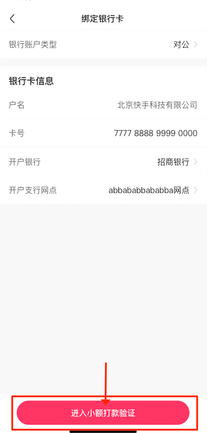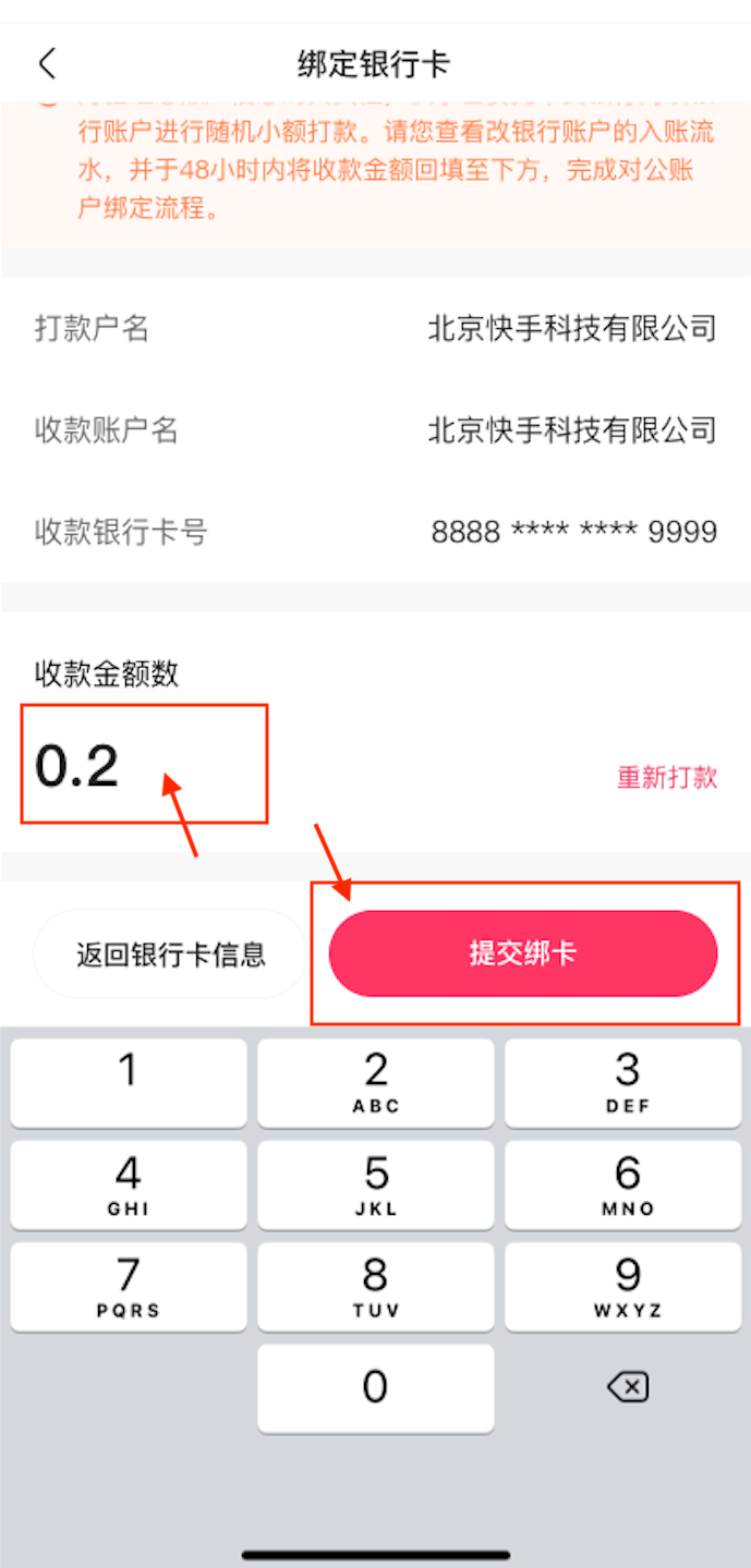 企业类型主体——需验证法人本人实名认证手机号的验证码,验证成功后即可绑定银行卡信息。账户类型仅支持对公账户,填写对公的银行卡卡号和开户支行网点,点击【进入小额打款验证】,您填写的银行卡会收到快手委托平安银行进行的随机小额打款验证,您需要48小时内将收款金额填写至【收款金额数】,并点击【提交绑卡】,即可完成绑定。