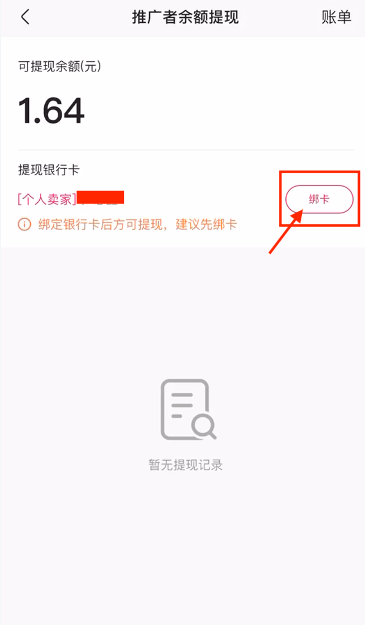 绑定提现账户:完成资质信息填写后,点击页面中的【绑定提现账户】或者在【查看钱包】-【绑卡】进入绑卡操作: