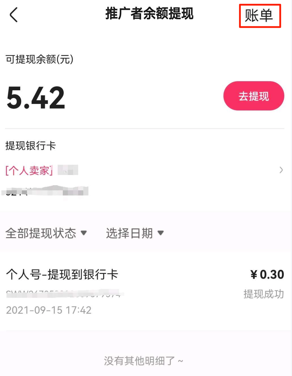 提现路径:点击【app端卖家后台】-【佣金收入】-【账单管理】-【达人钱包】-【查看查看钱包】-【去提现】
