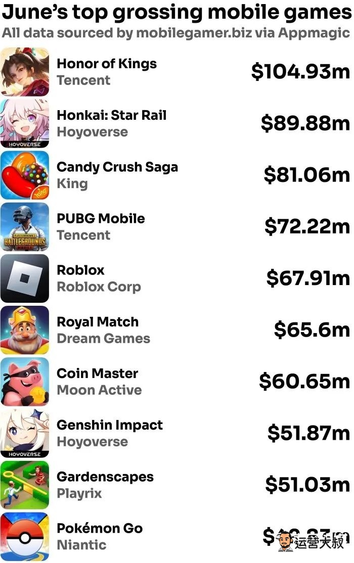 近日,Appmagic近日公布了6月全球手游收入榜。