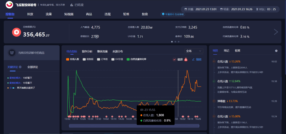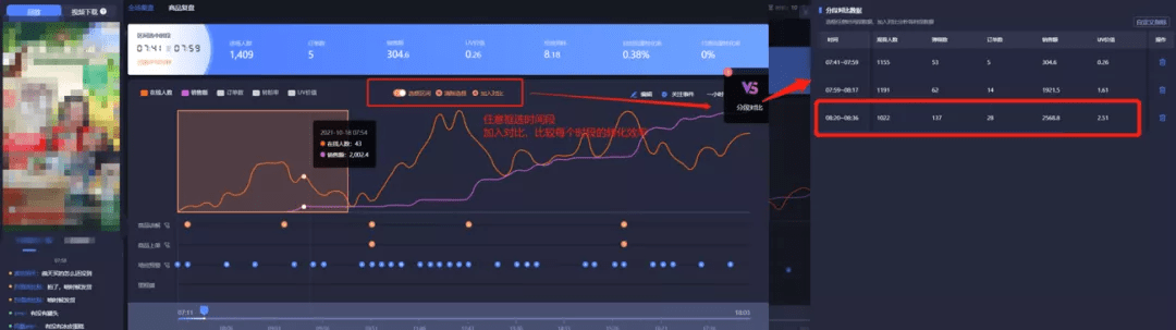 那他们切片的视频素材是怎么选择的呢?一般会监控直播时的留存和转化,比如下面这个直播间,可以发现这个时段是高留存且高转化的,那就可以通过【录像】下载这个时间段的片段,作为切片素材。