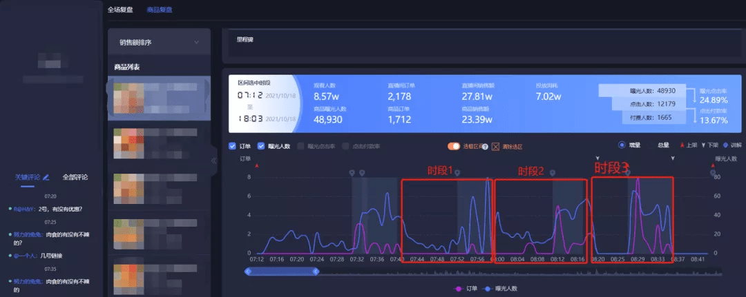 要不断复盘历史直播,通过曝光点击率和付款率找到整场直播比较好的憋单时间点。比如下面这个直播间,3次憋单中发现时段3转化效率是最高的,说明时段3的憋单时长更能激发用户下单。