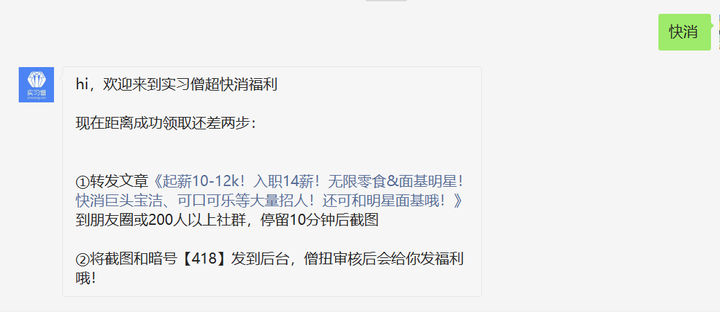 就比如说刺猬实习校招这个公众号把,它每个月都会举办一个活动,期间可以领取一些公司的招聘资料。只要用户关注公众号,回复关键字,扫码进群并发分享推文到朋友圈,就可以参与活动领取奖品。